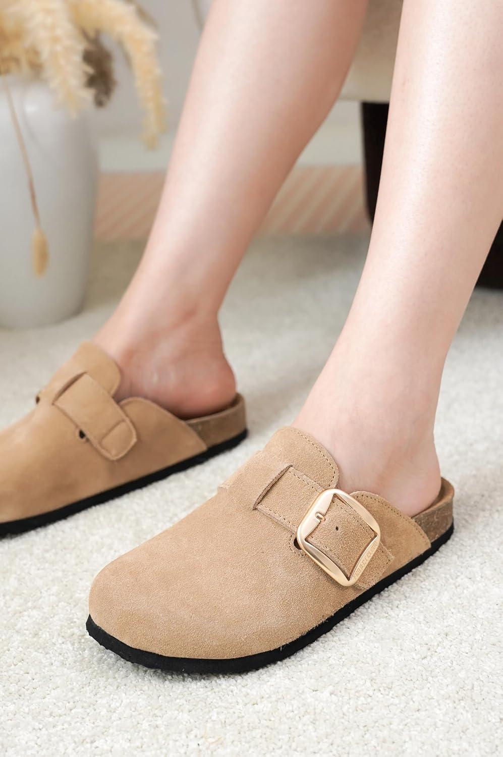Project Cloud 100% Genuine Leather Clogs for Women Shoes – Memory Foam Insole, Non-Slip & Natural Cork Footbed Arch Support Big Buckle Womens Clogs and Mules Footwear (Manchester)(Beige)