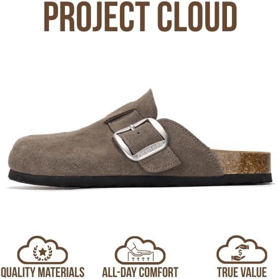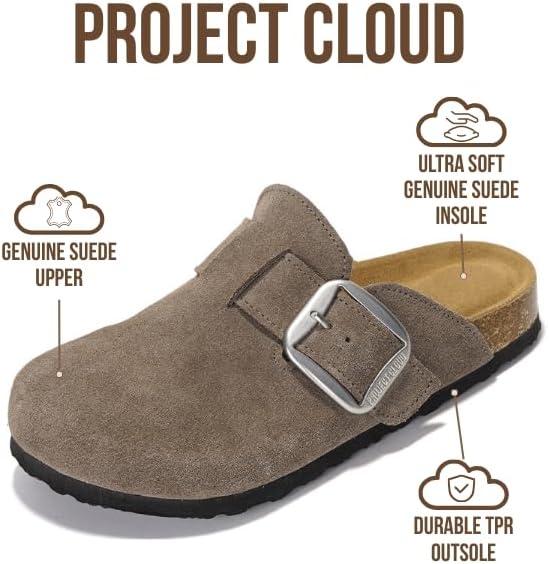 Project Cloud 100% Genuine Leather Clogs for Women Shoes – Memory Foam Insole, Non-Slip & Natural Cork Footbed Arch Support Big Buckle Womens Clogs and Mules Footwear (Manchester)(Storm Suede)