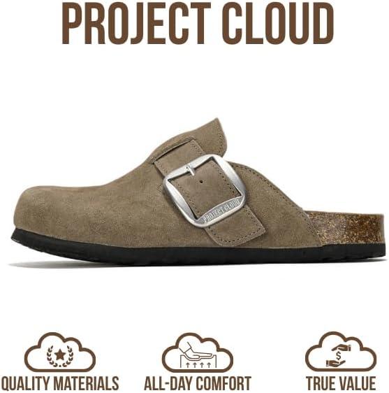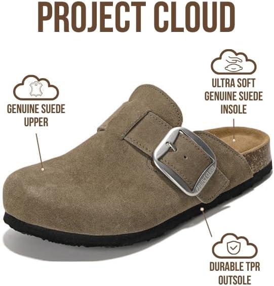 Project Cloud 100% Genuine Leather Clogs for Women Shoes – Memory Foam Insole, Non-Slip & Natural Cork Footbed Arch Support Big Buckle Womens Clogs and Mules Footwear (Manchester)(Storm Suede)