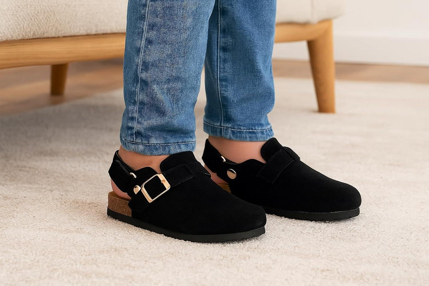 Project Cloud 100% Genuine Leather Kids Clogs with Cork Footbed Arch Support – Non-Slip Slippers & Sandals for Boys & Girls Footwear(Black Suede With Back Strap)