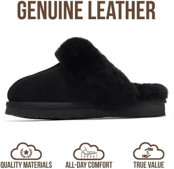 Project Cloud 100% Genuine Leather Slippers for Women Footwear with Genuine Fur Lining Womens Clogs & Mule – Non-Slip Indoor/Outdoor Scuff Womens Slippers with Memory Foam Insole (Henka)(Black)