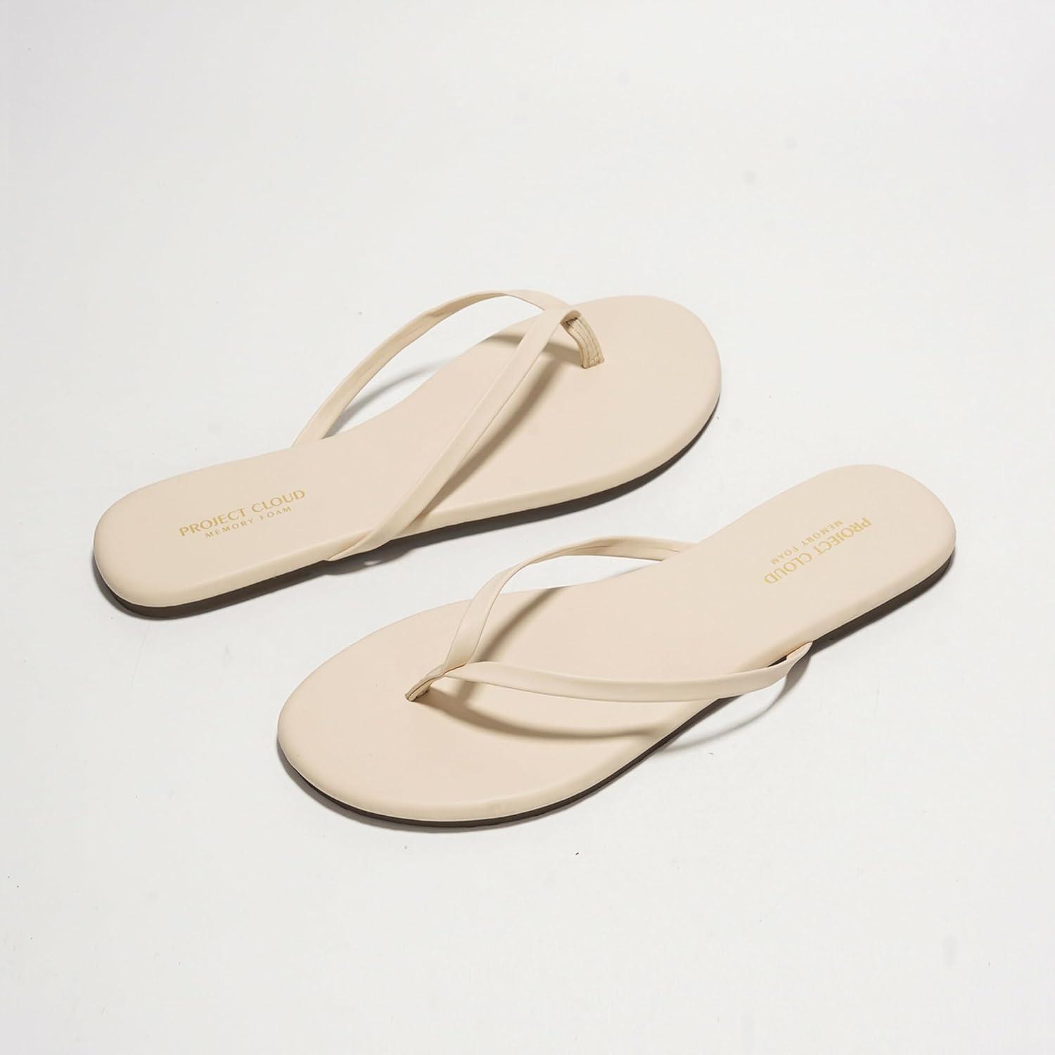 Project Cloud Flip Flops for Women – Memory Foam Flats Summer Sandals for Women 2025 – Vegan Leather Lightweight Womens Sandals Summer Beach Essentials Slides(Bone)