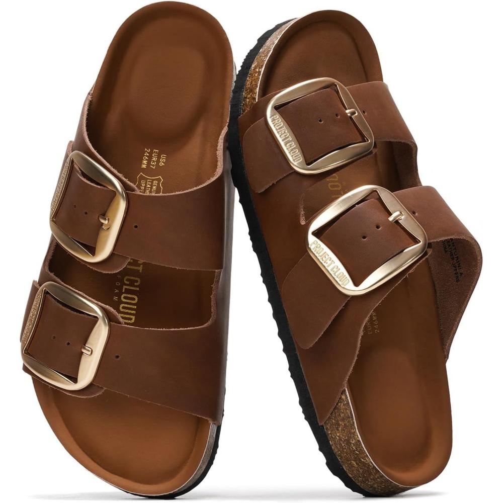 Project Cloud Genuine Leather Flat Sandals for Women 2026 Comfortable Beach Essentials Womens Sandals Memory Foam Vacation Essentials Slides for Women Footwear (Santorini)(Brown)