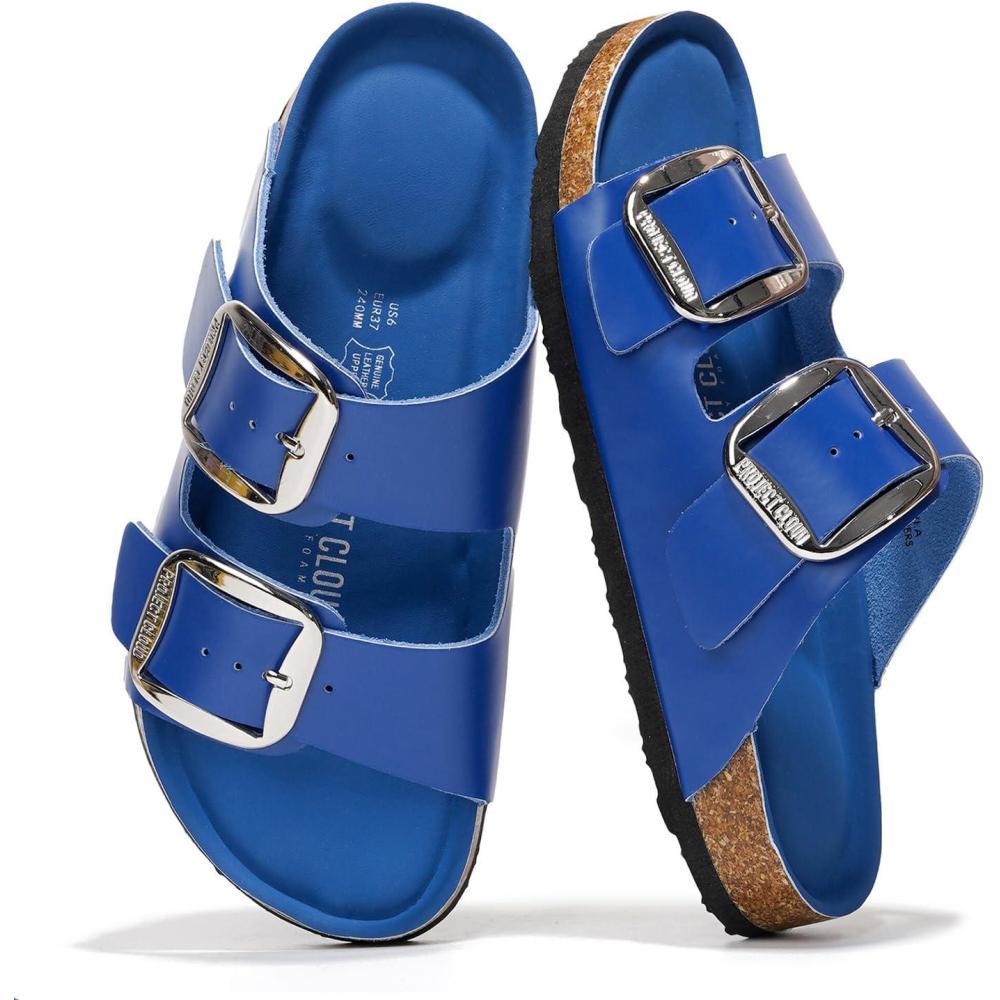 Project Cloud Genuine Leather Flat Sandals for Women 2026 Comfortable Beach Essentials Womens Sandals Memory Foam Vacation Essentials Slides for Women Footwear (Santorini)(Cobalt)