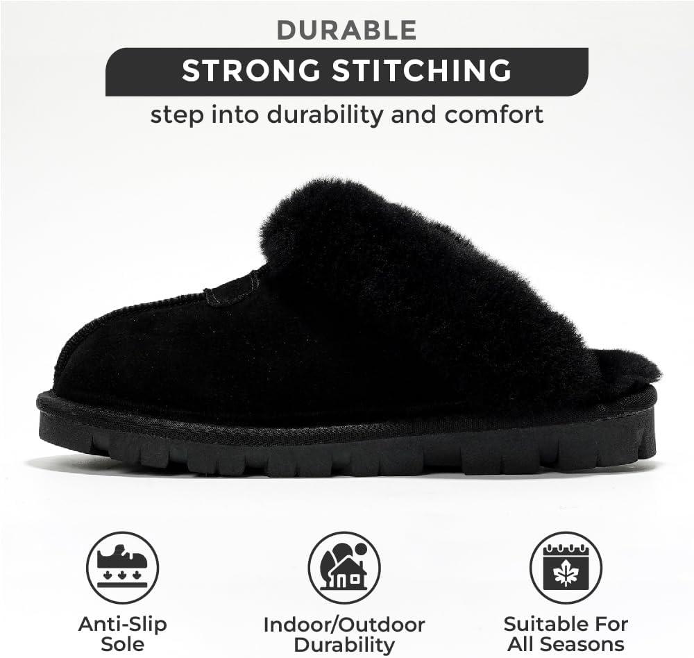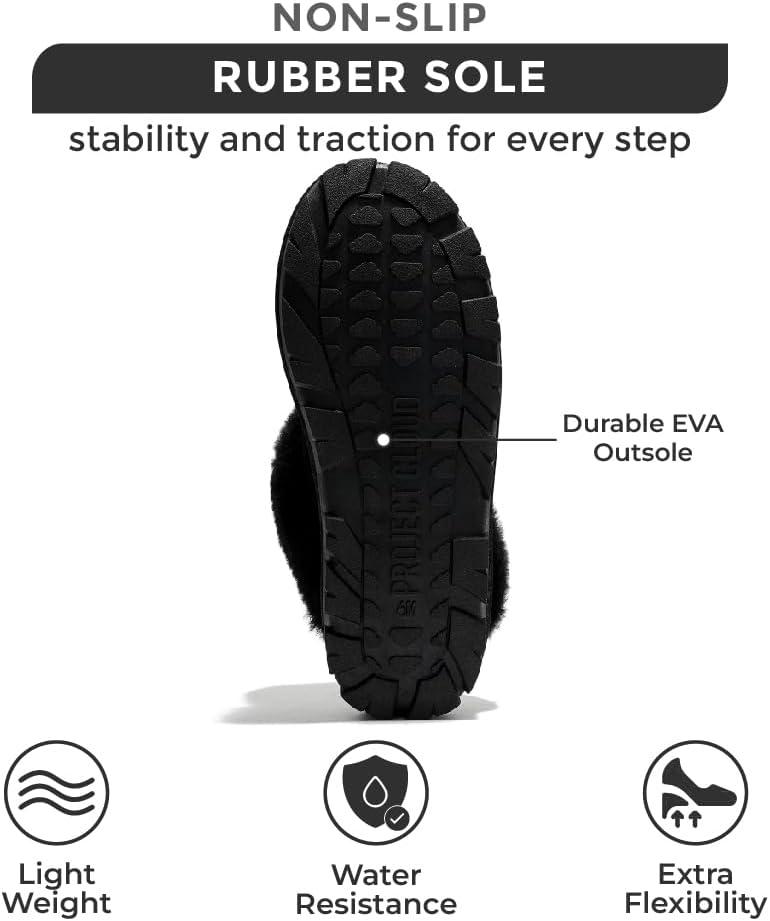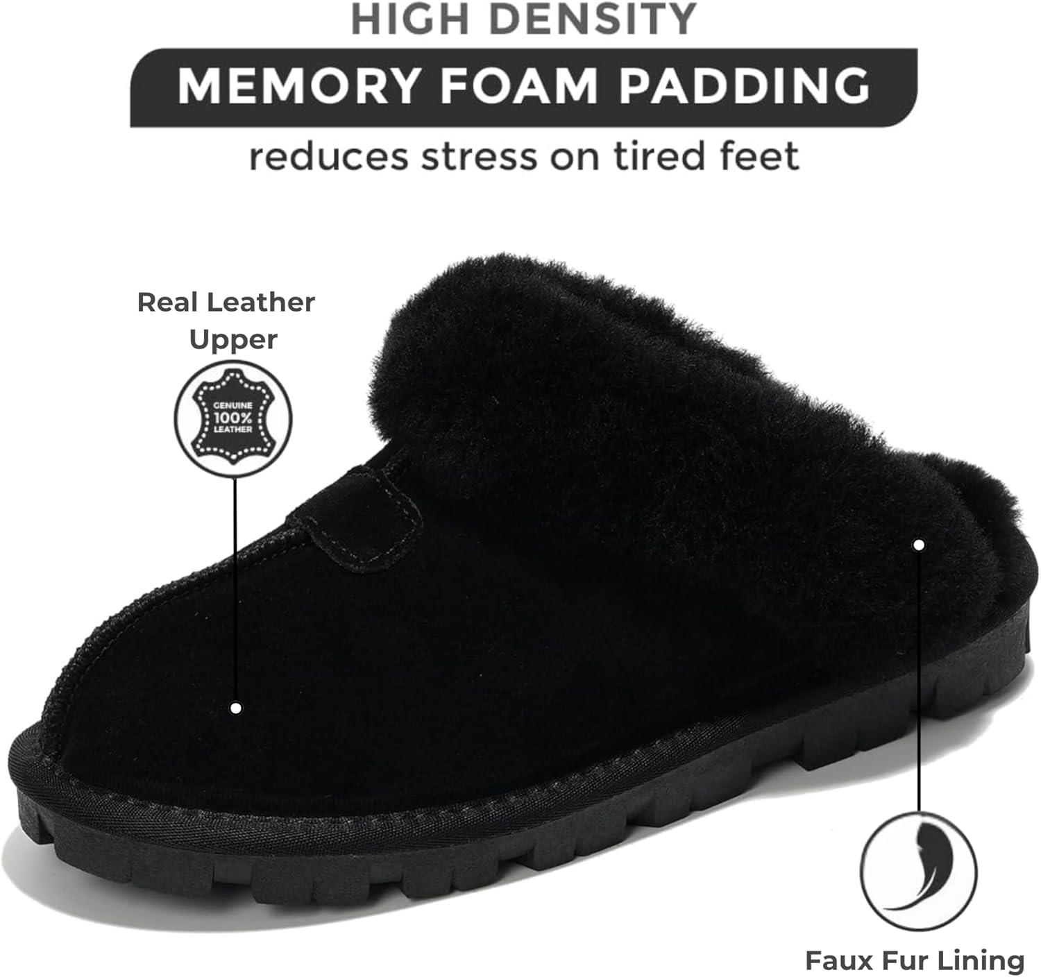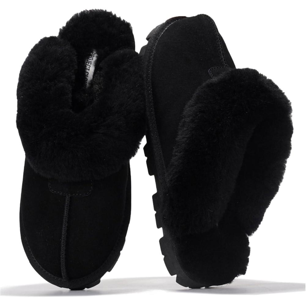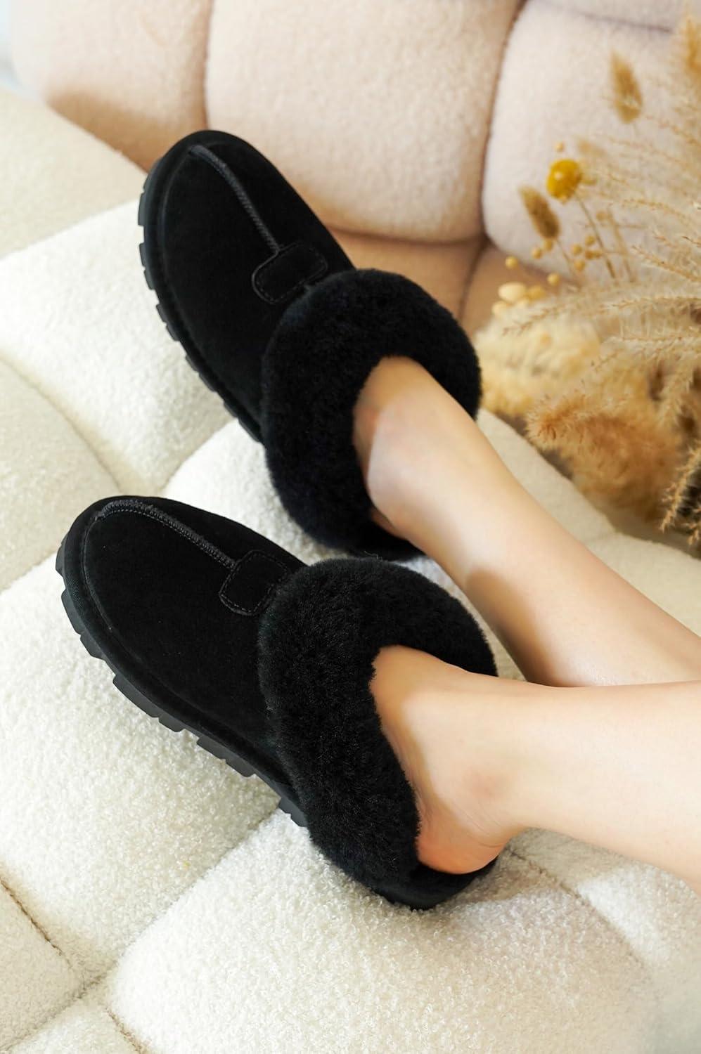 Project Cloud House Slippers for Women – Genuine Leather & Natural Fur Lining Fluffy Slippers – Memory Foam Womens Shoes (Hedy)(Black)