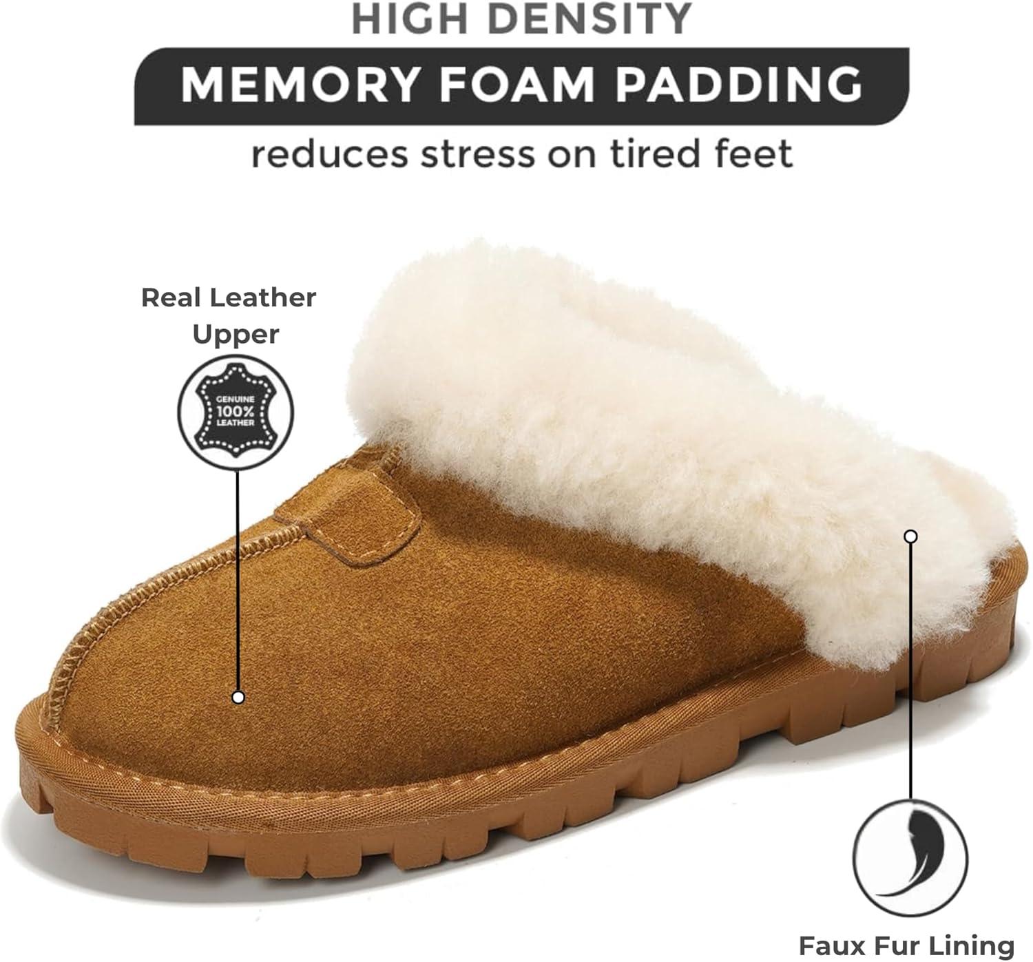 Project Cloud House Slippers for Women – Genuine Leather & Natural Fur Lining Fluffy Slippers – Memory Foam Womens Shoes (Hedy)(Chestnut)