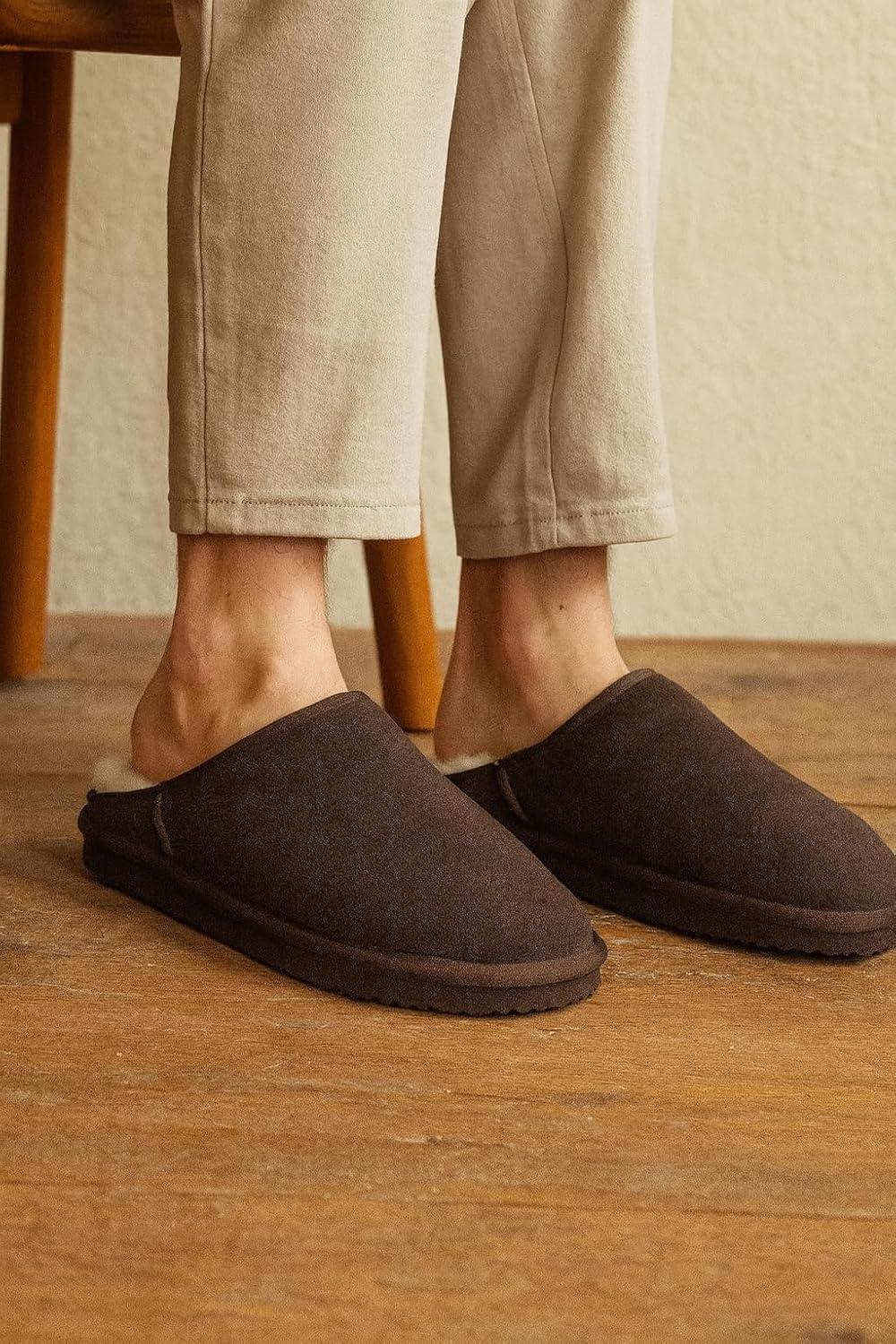 Project Cloud Mens Slippers 100% Genuine Leather and Genuine Shearling Lining – House Slippers for Men with Memory Foam Insole – Lightweight & Non Slip Mens House Shoes (Chill)(Choco Brown Suede)