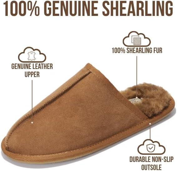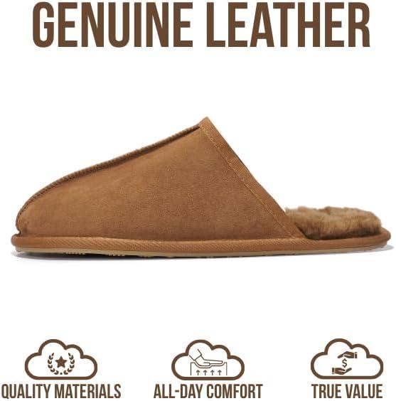 Project Cloud Mens Slippers 100% Genuine Leather and Genuine Shearling Lining – House Slippers for Men with Memory Foam Insole – Lightweight & Non Slip Mens House Shoes (Chill)(Chestnut Scuff)